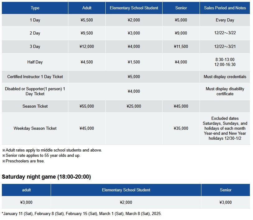 Cheaper lift tickets are available at the beginning of the season (until late December) and for the spring season (from late March). Various online specials can also be found (in Japanese only). Togari Onsen may have some of the cheapest season passes in the world, if you take some time to look online and buy early! See the official Togari Onsen ski page here.